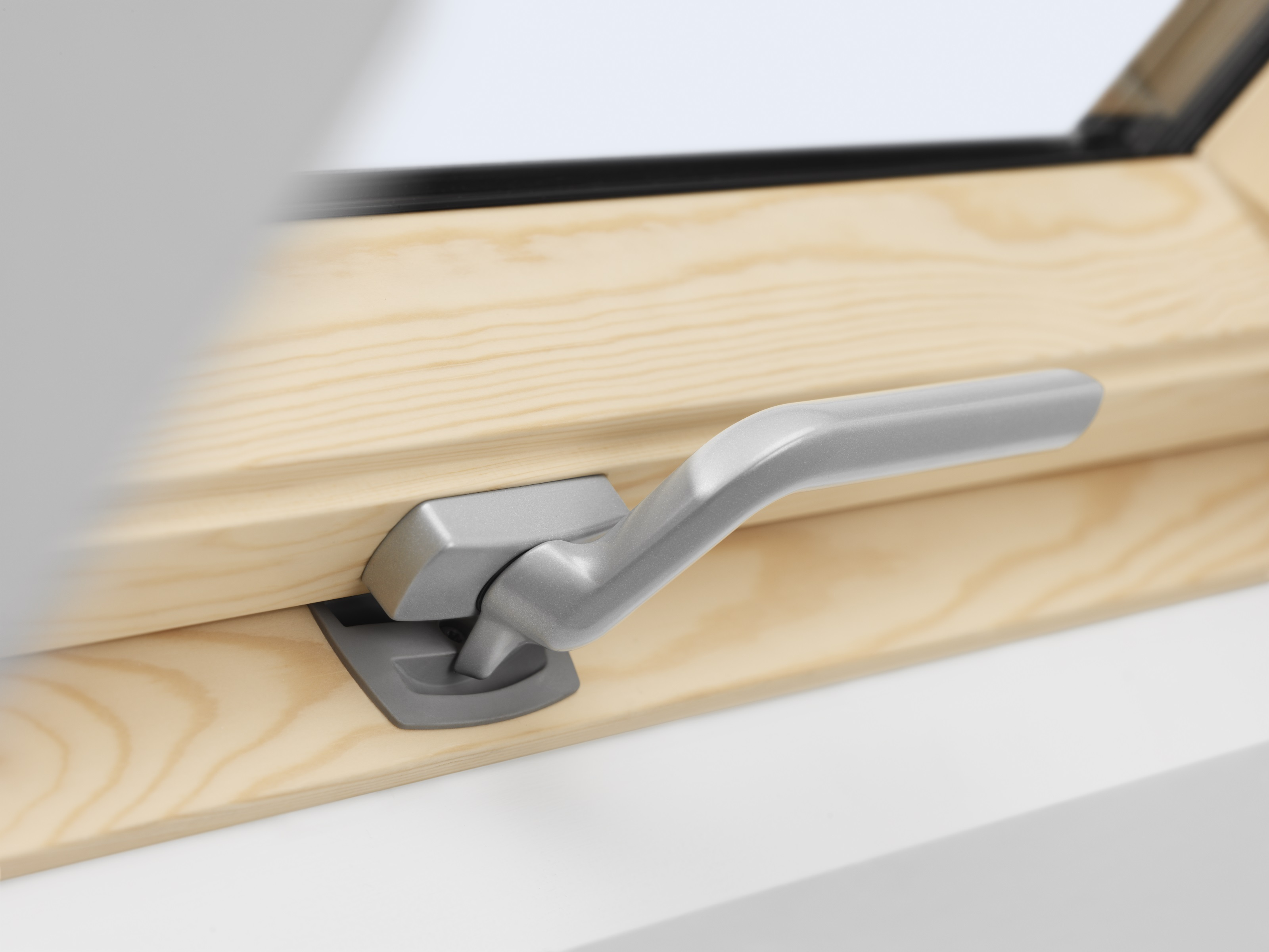 Nowa, ocynkowana klamka umieszczona w dolnej części została zaprojektowana, aby ułatwić wygodne otwieranie i zamykanie okien zamontowanych wysoko. Aby umyć szybę, należy po prostu obrócić je o 180° i zablokować zasuwką skrzydło.