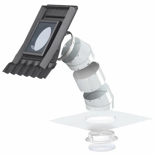 W zestawie ma 2 kolana wyprofilowane pod kątem 45 stopni. Lustrzana powłoka refleksyjna we wnętrzu tunelu zapewnia 98% wewnętrznego odbicia światła. Łatwy w montażu element sufitowy jest dostępny w komplecie z matową poliwęglanową ramą izolacyjną. Element dachowy z wyjmowanym skrzydłem okiennym jest zbudowany z hartowanego szkła o grubości 4 milimetrów. Szyba posiada powłokę łatwozmywalną od strony dachu.
